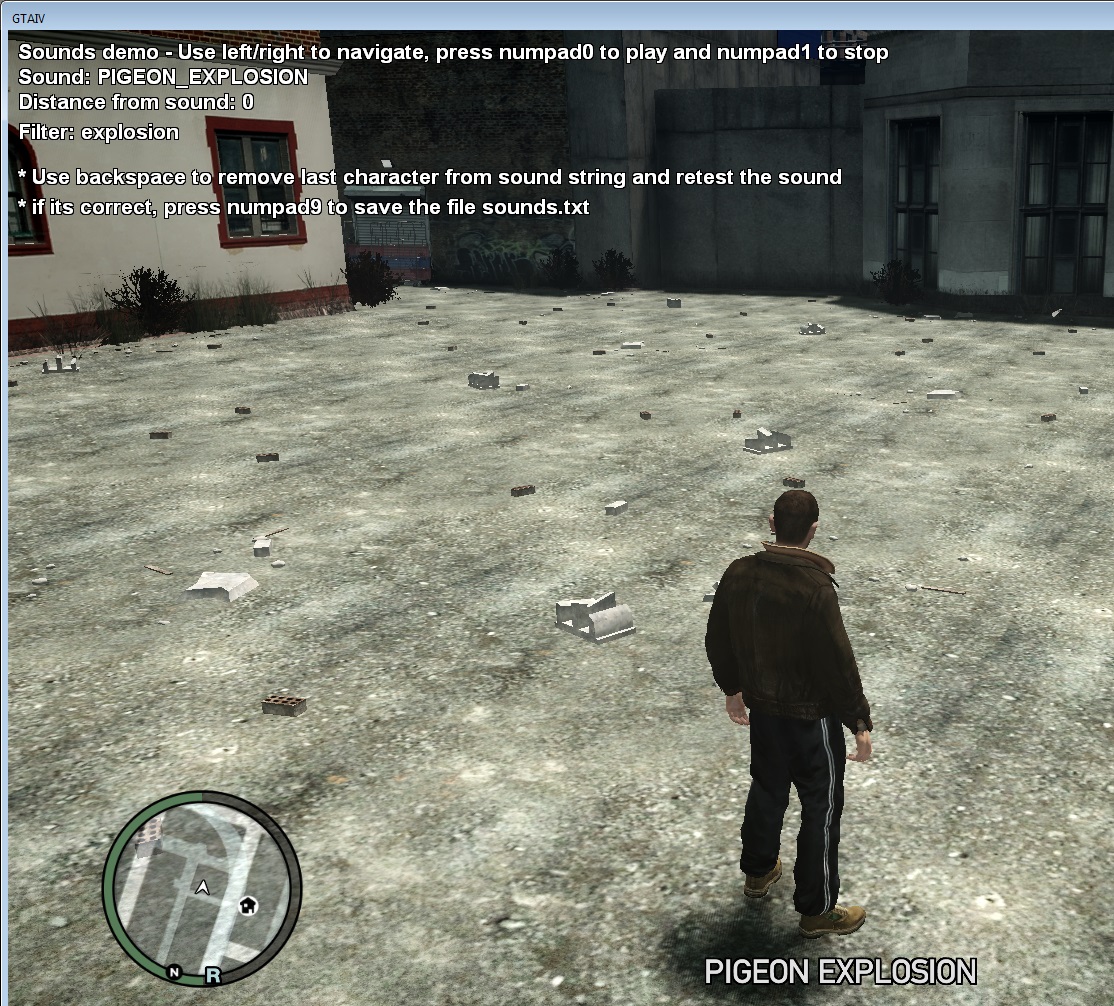 Now close the console window and press Left/Right to change between filtered sounds, the name of the sound appears in the bottom of the screen and the sound should be played, you will easily find the sound "PIGEON_EXPLOSION" that is the sound of an poor pigeon dieing when shot ^^